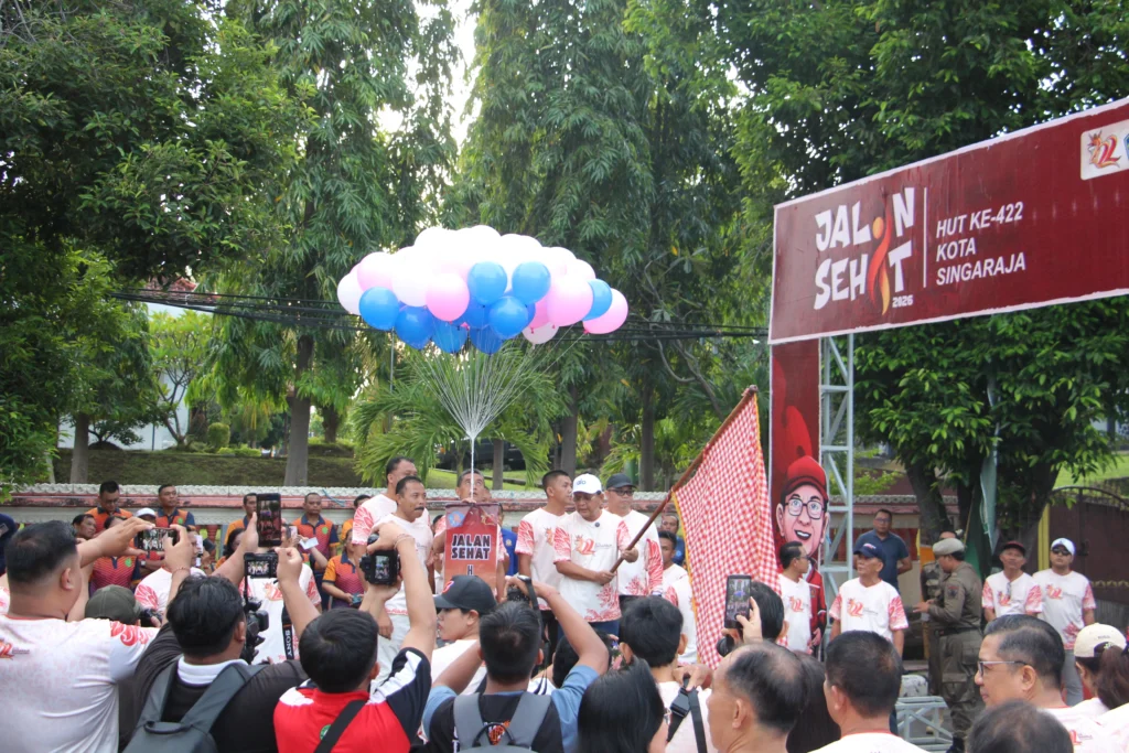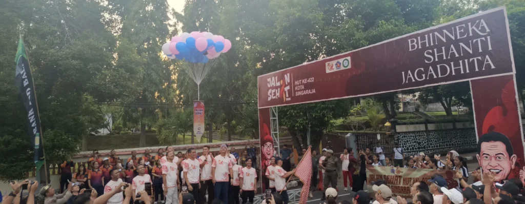 Buleleng – Dalam rangka memeriahkan peringatan Hari Ulang Tahun (HUT) ke-422 Kota Singaraja Tahun 2026 yang mengusung tema “Bhineka Shanti Jagadhita”, hari ini (6/3) dilaksanakan kegiatan jalan sehat yang diikuti oleh berbagai instansi di Kabupaten Buleleng.